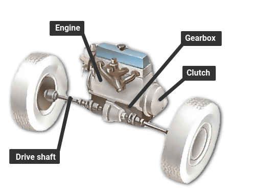 الجيربوكس يجزئ نسبة القوة إلى تروس حسب سرعة السيارة. ثم ينقلها إلى عمود الكردان أو الدرايف شافت عبر (ترس 1 و 2 و 3 و 4)، ومن ثم إلى الدفرنس.